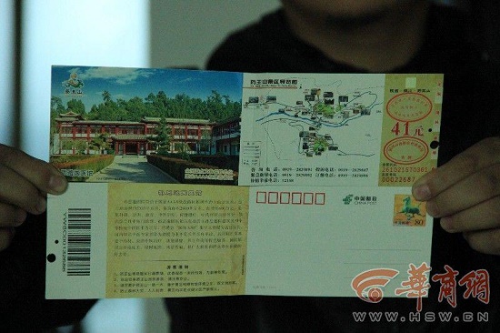 劉先生向華商報記者提供了他們當時買的兩張藥王山景區(qū)門票,該門票票面印制著“41元”的價位,門票的正面有景區(qū)導(dǎo)覽圖和宣傳圖片,折疊在里面才顯示有“中國郵政”字樣,并印有80分的郵資。劉先生說,他一不是集郵愛好者,不收藏門票,二也沒有寄送明信片的意愿,藥王山這種做法多少有點強制消費的意思。