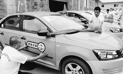 國慶期間,西安眾泰出租汽車有限公司從外地購進(jìn)的47輛新車到貨,股東們?yōu)樾萝囐N上公司的標(biāo)識(shí)。