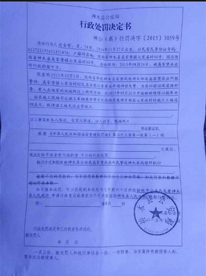 2015年8月27日,在未兌現(xiàn)陰宅基地的補償款的情況下,華電修路占用了屈金有的檸條地,毀壞了屈金有所種的檸條。屈金有進行交涉,神木縣公安局高家堡派出所即以阻當工地為由將屈金有治案拘留十日。在拘留十日期間,華電迅速將路修通,毀壞了屈金有陰宅基地和檸條地。