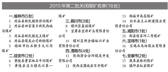 陜西省政府日前下發(fā)通知,公布了2015年第二批關(guān)閉煤礦名單18處。