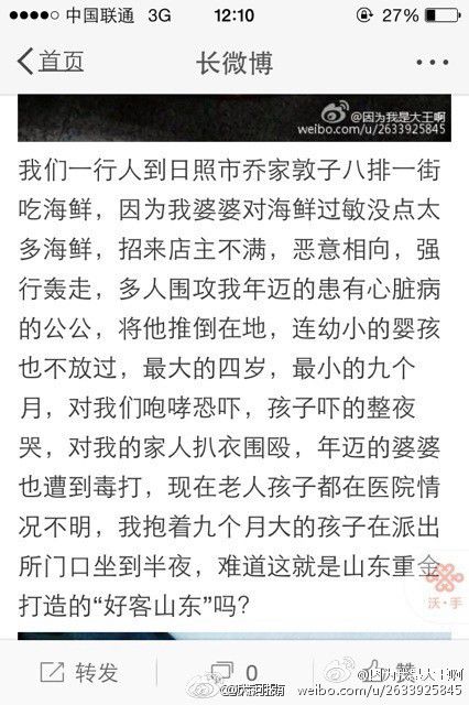 【河南網(wǎng)友稱在日照點海鮮太少被毆打】@因為我是大王啊:我們一行人到日照喬家敦子八排一街吃海鮮,因婆婆對海鮮過敏沒點太多海鮮,招來店主不滿,將公公推倒在地。連嬰孩也不放過,最大的四歲,最小的九個月,對我們咆哮恐嚇,對家人扒衣圍毆,年邁的婆婆也遭到毒打,現(xiàn)在老人孩子都在醫(yī)院。
