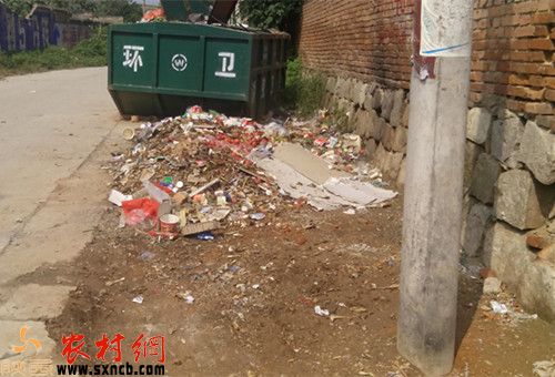 大明鎮(zhèn)中心幼兒園不遠處的垃圾箱周圍,遍布垃圾
