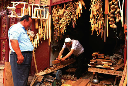 記者在老城看到的最多的手藝人正是木雕藝人,小小一間屋子,藝人師傅們幾乎被埋在木制品中。他們除了做建筑部件,還做嬰兒搖籃,學(xué)步車,還有打馕用的印圖案的小工具。最后剩下的小木頭塊,可雕成小葫蘆狀的鑰匙扣—用水彩筆畫上具有喀什元素的圖案,簡(jiǎn)簡(jiǎn)單單的紅綠兩色,刷上清漆后透亮,是很好的紀(jì)念品。