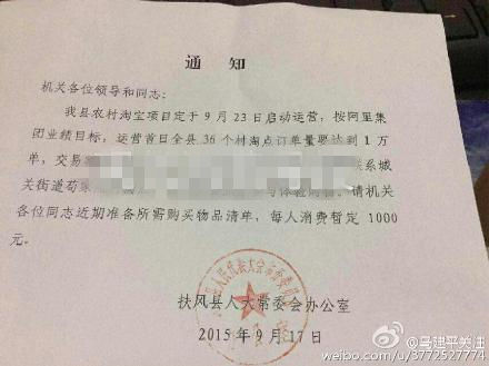 網(wǎng)友還曬出了一張有“扶風(fēng)縣人大常委會辦公室”落款及蓋章的通知。通知上寫到,“機(jī)關(guān)各位領(lǐng)導(dǎo)和同志:我縣農(nóng)村淘寶項(xiàng)目定于9月23日啟動運(yùn)營,按阿里集團(tuán)業(yè)績目標(biāo),運(yùn)營首日全縣36個(gè)村淘寶點(diǎn)訂單要求達(dá)到一萬單”。通知最后稱,“請機(jī)關(guān)各位同志近期準(zhǔn)備所需購買物品清單,每人消費(fèi)暫定1000元?!?/p>
