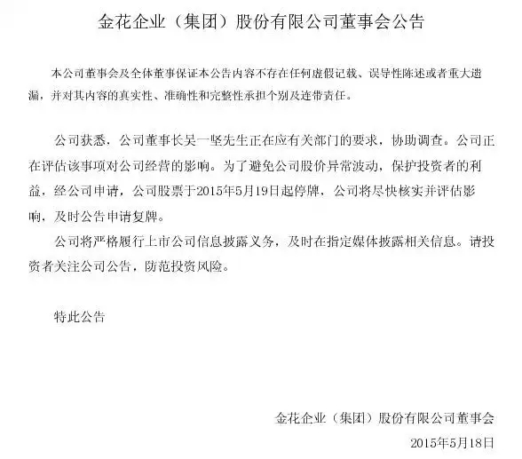 2015年5月18日晚,金花股份發(fā)布公告稱,公司董事長吳一堅(jiān)正應(yīng)有關(guān)部門要求,協(xié)助調(diào)查。公司正在評估該事項(xiàng)對公司經(jīng)營的影響。為了避免公司股價(jià)異常波動(dòng),保護(hù)投資者的利益,經(jīng)公司申請,公司股票于2015年5月19日起停牌。