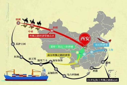 絲綢之路經(jīng)濟(jì)帶,是中國(guó)與西亞各國(guó)之間形成的一個(gè)在經(jīng)濟(jì)合作區(qū)域,大致在古絲綢之路范圍之上。包括西北陜西、甘肅、青海、寧夏、新疆等五省區(qū),西南重慶、四川、云南、廣西等四省市區(qū)。2013年由中國(guó)國(guó)家主席習(xí)近平在哈薩克斯坦納扎爾巴耶夫大學(xué)演講時(shí)提出。