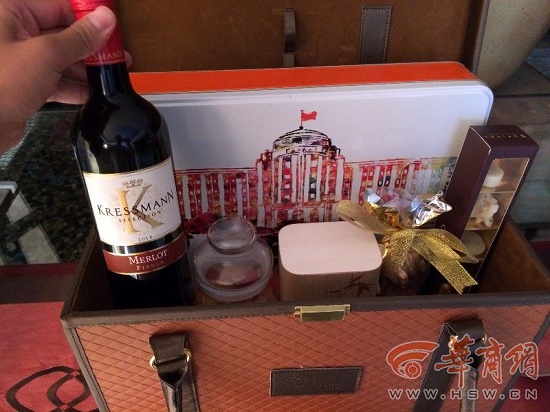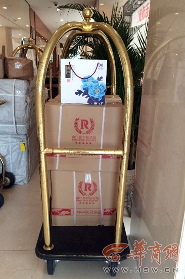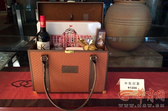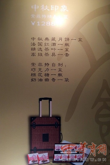 9月15日上午,西安索菲特人民大廈院內(nèi),一塊銷售月餅的大幅廣告噴繪懸掛在墻上。順著工作人員指引,華商報記者來到了國際會議中心內(nèi),售賣月餅的展臺擺放在一層大廳顯眼的位置。該酒店所售賣的月餅有三種,268元/8粒、398元/18粒、1288元的月餅禮盒。其中,1288元的月餅禮盒內(nèi),除了有268元的中秋典藏月餅一盒外,還包括一瓶法國紅酒、一盒精選茶葉、一套高級茶具和索菲特酒店自制的一盒巧克力、一瓶棉花糖、一袋奶油曲奇。工作人員稱,這些東西要用一個旅行箱來裝。