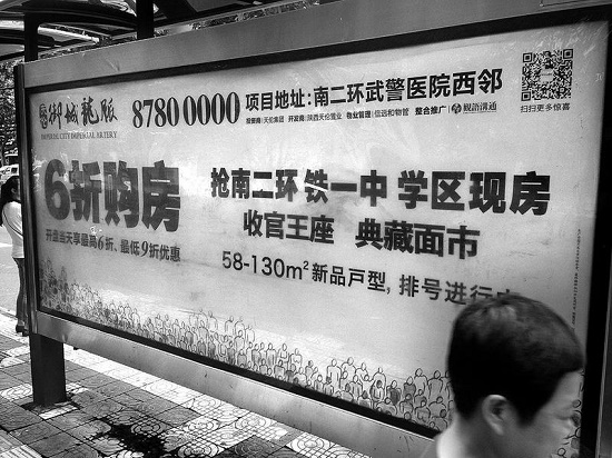 接梁先生投訴,記者于昨日中午驅(qū)車前往御城龍脈,打算一探究竟。在距離售樓部還有100多米時(shí),記者注意到,一個(gè)醒目的廣告牌映入記者的眼簾,上有“6折購房,鐵一中學(xué)區(qū)現(xiàn)房,收官王座”等內(nèi)容。