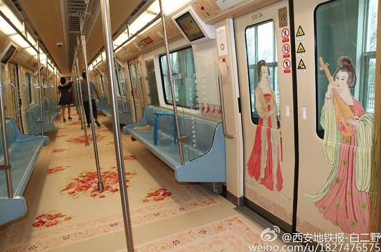 9月21日,西安地鐵“絲綢之路文明號(hào)”專列將正式開行。這列車圍繞絲綢之路六節(jié)車廂組成六個(gè)系列,六節(jié)車廂主題分別為“開拓—鑿空西域”、“包容—萬(wàn)國(guó)來(lái)朝”、“互利—絲路商旅”、“互鑒—舞動(dòng)長(zhǎng)安”、“合作—文明相通”、“共贏—絲路復(fù)興”。