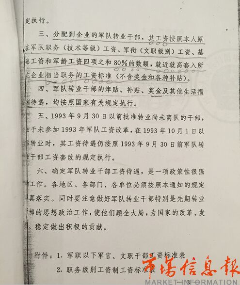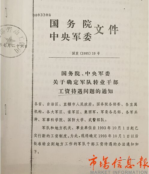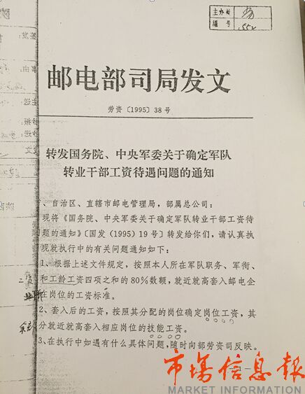 記者看到,就軍轉(zhuǎn)干部工資待遇問題,國務(wù)院、中央軍委【國發(fā)(1995)19號】文件上寫著:分配到企業(yè)的軍隊(duì)轉(zhuǎn)業(yè)干部,其工資按照本人原在軍隊(duì)職務(wù)(技術(shù)等級)工資四項(xiàng)總和的80%數(shù)額,就近就高套入所在企業(yè)相當(dāng)職務(wù)的工資標(biāo)準(zhǔn)。而郵電部【勞資(1995)38號】文件則規(guī)定:分配到企業(yè)的軍隊(duì)轉(zhuǎn)業(yè)干部,其工資按照本人原在軍隊(duì)職務(wù)(技術(shù)等級)工資四項(xiàng)總和的80%數(shù)額,就近就高套入郵電企業(yè)所在崗位工資標(biāo)準(zhǔn)。