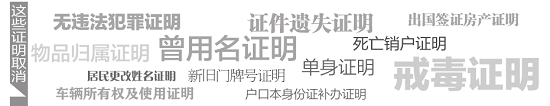 今后,以下這23項證明全部取消:無違法犯罪證明、曾用名證明、證件遺失證明、物品歸屬證明、單身證明、出國探望親人的親屬關系證明、死亡銷戶證明、新舊門牌號證明、身份證姓名與檔案或戶口本不一致證明、車輛所有權及使用證明、辦理簽證或外籍人員延長簽證的居住證明、出國簽證房產證明、社區(qū)消防安全證明、加油證明、戒毒證明、交警暫扣車輛車主認領證明、戶口所在地是否在本小區(qū)證明、戶口本身份證補辦證明、居民更改姓名證明、新生兒未隨父或隨母落戶證明、網吧安全審查中由申報人提供的《網吧地里位置圖》、特行行政許可手續(xù)中法人無違法犯罪證明、辦理各類戶口業(yè)務中的戶籍證明。