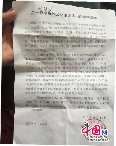 2015年6月15日,梁園區(qū)公路局和李莊鄉(xiāng)政府聯(lián)合給劉大爺下發(fā)了“關于限期拆除公路沿線違規(guī)違章的通知”。鄉(xiāng)政府工作人員告訴劉大爺:按商丘市政府要求,劉大爺需在8月20日前將房屋自行拆除,逾期未拆除的鄉(xiāng)政府將會同相關職能部門強行拆除,并稱沒有任何補償。