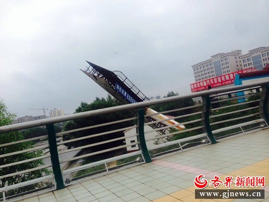 8月2日,位于長(zhǎng)城南路和富康交匯處的東北角,大風(fēng)把巨大的廣告牌子吹倒了。幸虧是牌子掉到了旁邊的溝里,所以沒(méi)造成人員傷亡,只是把一個(gè)檢查井給損毀了。倒在馬路上,來(lái)往車輛比較多,還有行人,實(shí)在太危險(xiǎn)了。