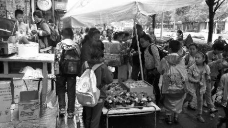 隨后華商報(bào)記者又走訪了多所小學(xué)發(fā)現(xiàn),很多學(xué)校門口的售賣小吃的攤位都是以三輪摩托車或者小推車為主,沒(méi)有固定的水源,有的連裝水的水桶都很難見(jiàn)到。清理灶臺(tái)用的是一條根本無(wú)法及時(shí)清洗的毛巾,攤主既用其來(lái)擦汗,也用其來(lái)擦拭操作臺(tái),很難做到基本的衛(wèi)生保障,但是來(lái)消費(fèi)的小學(xué)生卻絡(luò)繹不絕。