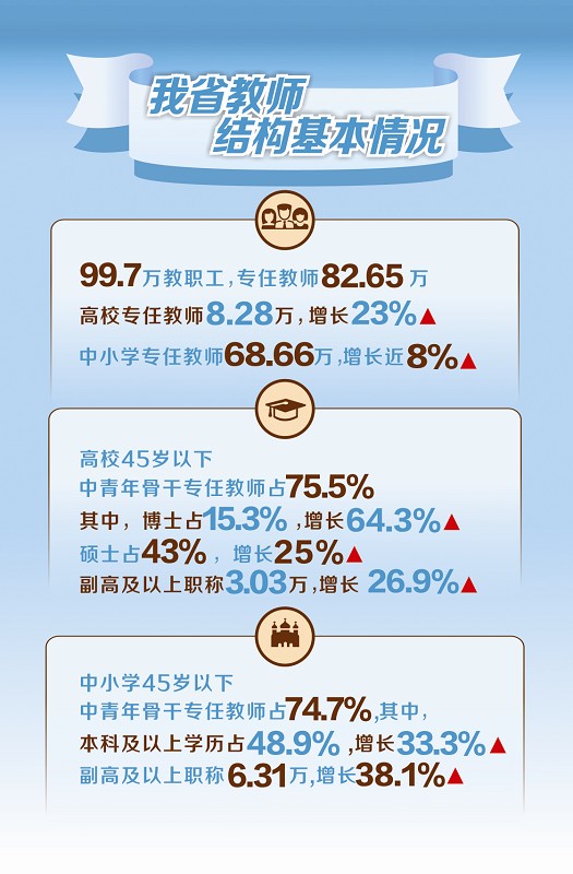 一系列政策舉措的實(shí)施,促進(jìn)四川省教師隊(duì)伍的年齡結(jié)構(gòu)、學(xué)歷結(jié)構(gòu)、職稱結(jié)構(gòu)逐步優(yōu)化。目前,四川省99.7萬教職工中,專任教師達(dá)82.65萬,較2010年增長(zhǎng)8.2%。高校45歲以下中青年骨干專任教師占75.5%,中小學(xué)45歲以下中青年骨干專任教師占74.7%。