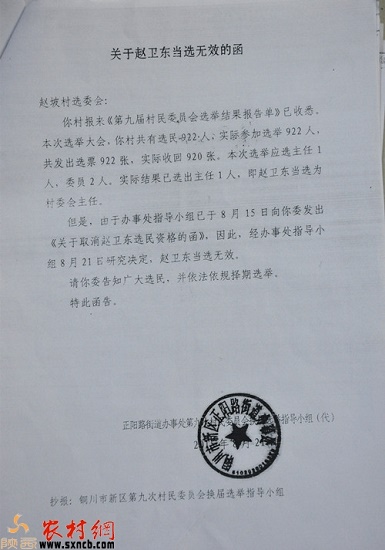 銅川市新區(qū)正陽(yáng)路街道辦關(guān)于趙衛(wèi)東當(dāng)選無(wú)效的函
