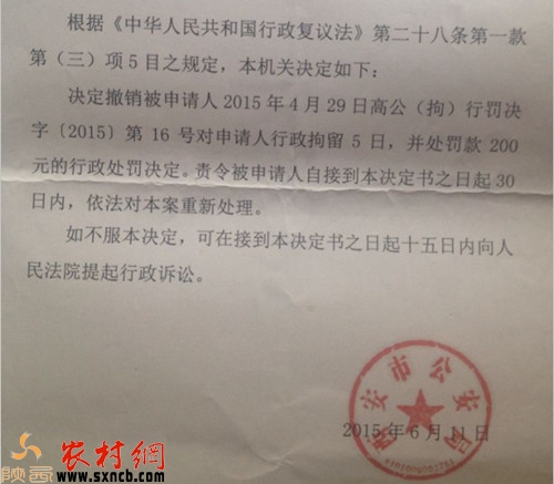 盡管高陵區(qū)公安局對田懷章的兩次處罰按照相關法律不予執(zhí)行,但是田懷章認為處罰決定是一回事,不予執(zhí)行是另一回事。因而他再次向西安市公安局申請行政復議。2015年6月11日,西安市公安局再次做出西公法行復(2015)31號行政復議決定書。該決定書決定撤銷高陵區(qū)公安局重新作出的高公(拘)行罰決字[2015]第16號對申請人行政拘留5日,并處罰款貳佰元的行政處罰決定,并再次責令被申請人依法重新處理該案。