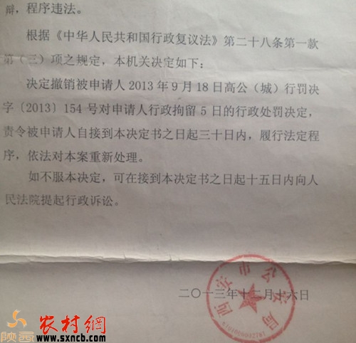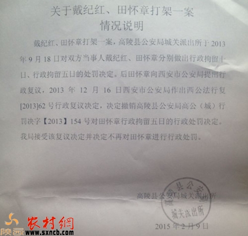9月6日,記者就田懷章所反映之事前往高陵區(qū)公安局進行情況了解,該局政工科一李姓民警對記者說,市局的行政復議是要求重新處理該案,公安局重新處理并無不當。