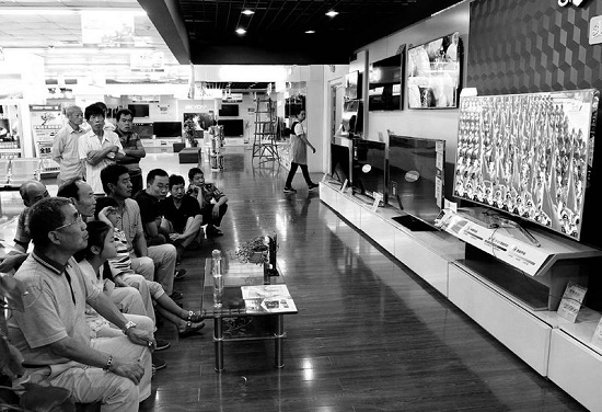 商場里市民圍著電視觀看閱兵式