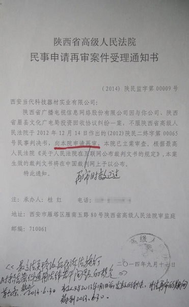 2014年9月17日,陜西高院對該案作出“民事申請再審案件受理通知書”。該通知書顯示,陜西廣電網(wǎng)絡(luò)公司不服陜西高院作出的終審判決,“向本院申請再審,本院已立案審查。”