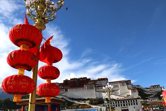 隨著西藏自治區(qū)成立50周年的大喜日子日益臨近,西藏各族各界干部群眾滿懷喜悅的心情,以各種不同的方式迎接大慶的到來。圖為張燈結彩、煥然一新的布達拉宮廣場。記者扎西攝