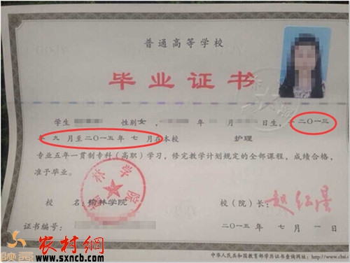 8月20日,記者在榆林市見到小張這份“特殊”的畢業(yè)證。畢業(yè)證顯示,小張于2013年9月至2015年7月在本校護理專業(yè)五年一貫制專科(高職)學習,修完教學計劃規(guī)定的全部課程,成績合格,準予畢業(yè)。畢業(yè)院校為榆林學院,并有榆林學院的蓋章及院長趙紅星的簽字。
